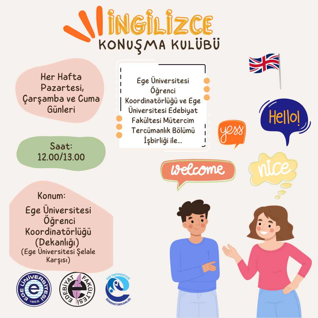 Öğrenci koordinatörlüğü ve Edebiyat Fakültesi işbirliği ile Üniversitemizde öğrenim gören tüm öğrencilerimize 06 Ekim 2025 tarihinden itibaren her Pazartesi, Çarşamba ve Cuma günleri 12.00-13.00 saatleri arasında Araştırma Odaklı Öğrenci Merkezinde (AROM) "İngilizce Konuşma Kulübü" ücretsiz olarak açılacak olup ilgili öğrencilerimize önemle duyurulur.
