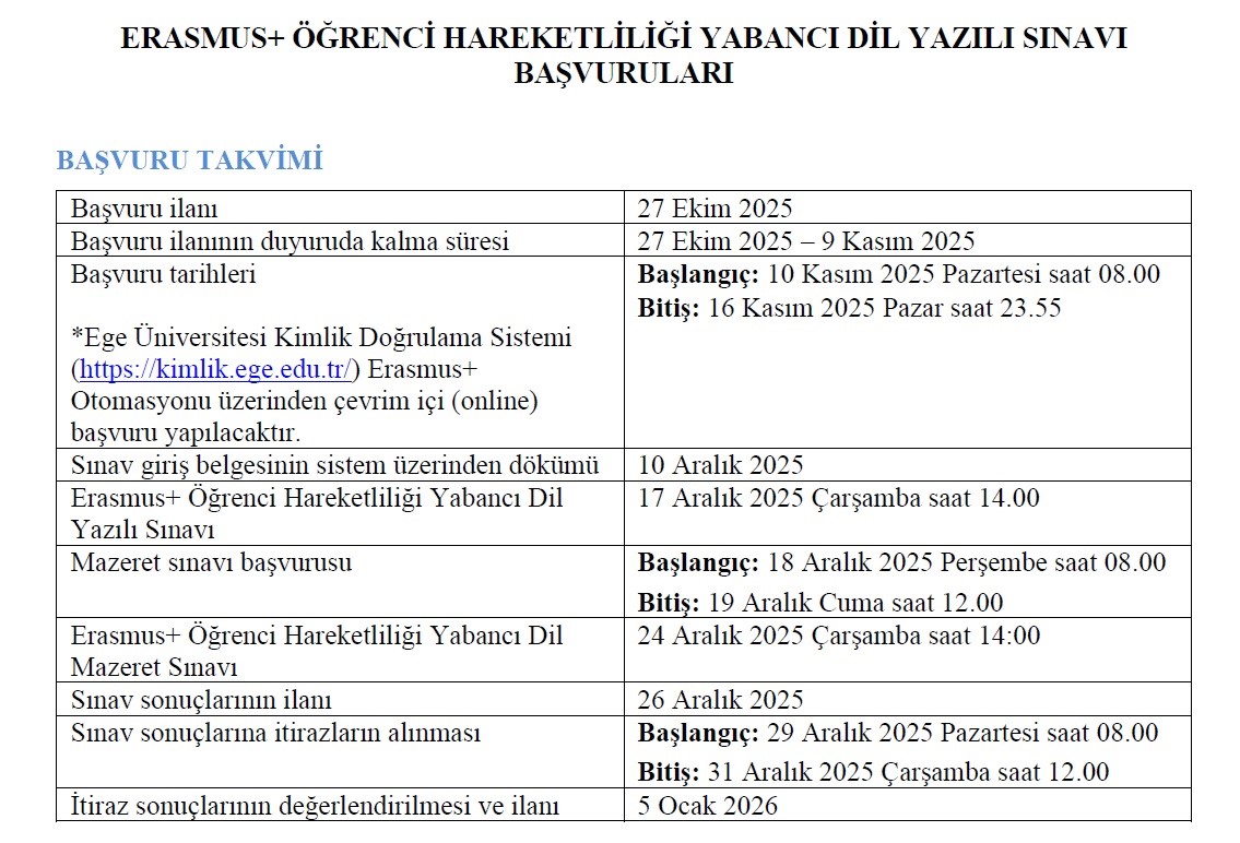 (https://kimlik.ege.edu.tr/) Erasmus+ Otomasyonu üzerinden çevrim içi (online) alınacaktır. Bu sınav, Erasmus+ KA131 ve KA171 Öğrenci Değişim Programları kapsamında